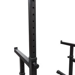Der Kniebeugenständer ist ausgelegt für eine Belastung von 250kg. Er ist höhenverstellbar und ausgestattet mit höhenverstellbaren Sicherheitsstangen. Der Ständer hat zusätzlich Dipgriffe an den Hantelablagen. Geeignet für verschiedene Kniebeugenvarianten, Schulterdrücken, Beugestützen.